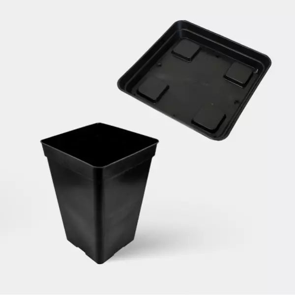 Macetas cuadradas de 7 litros con platos para una distribución ordenada.