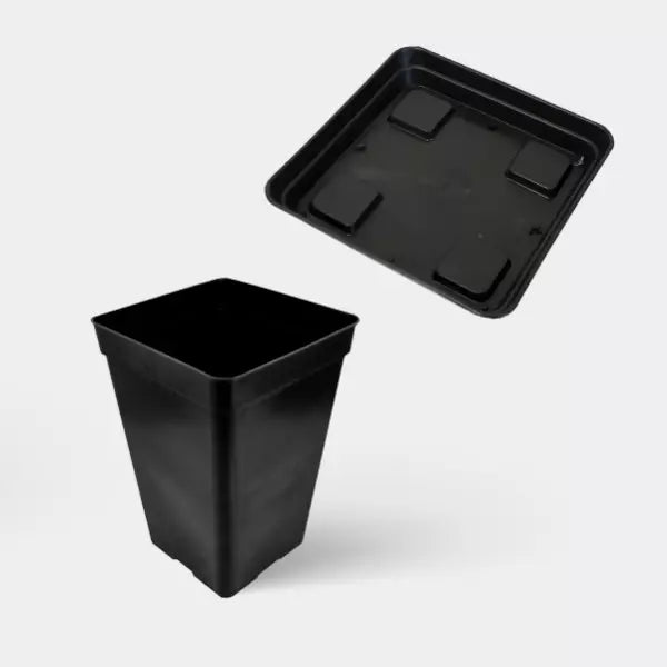 Macetas cuadradas de 7 litros con sus platos correspondientes para una distribución ordenada.