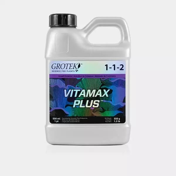 VitaMax Plus de Grotek es un suplemento vitaminado diseñado para aportar un amplio espectro de vitaminas y compuestos orgánicos que favorecen el crecimiento equilibrado, la resistencia al estrés y el vigor general de las plantas durante todas las fases del cultivo.